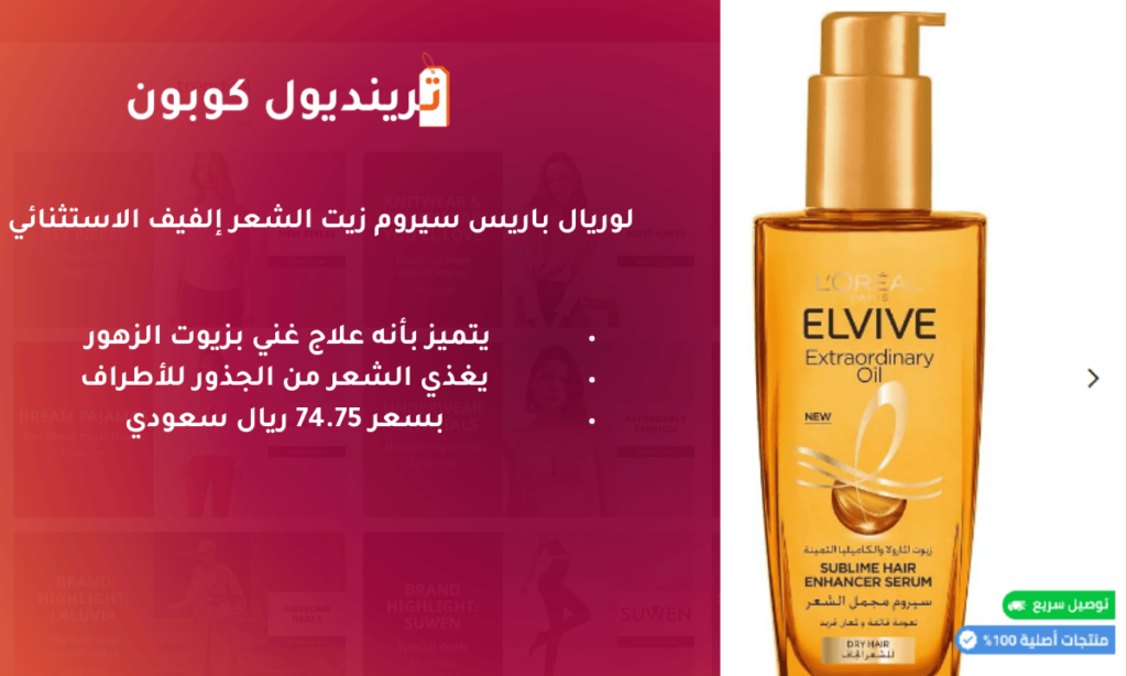 • يمكن أن يتم الحصول على الزيت من هنا بخصم قد يصل إلى 25% بسعر 29.36 ريال سعودي بدلاً من 39.15 ريال، حيث أن المتجر يوفر أفضل منتجات العناية بالشعر ترينديول بأقل الأسعار.